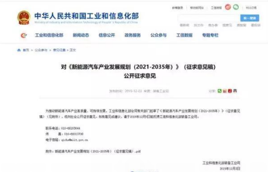 近日,工信部就《新能源汽车产业发展规划(2021-2035年)》(征求意见稿)公开征求意见。《意见稿》提出,2021年起,国家生态文明试验区、大气污染防治重点区域公共领域新增或更新用车全部使用新能源汽车。制定将新能源汽车研发投入纳入国有企业考核体系的具体办法。加快完善适应智能网联汽车发展要求的道路交通、事故责任、数据使用等政策法规。