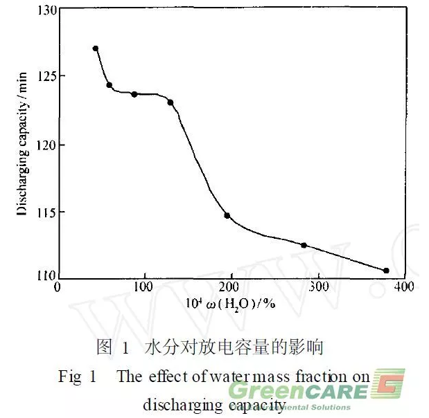 对于正极L ix CoO2电位,其控制因素就是Co4 + /Co3 + 这一氧化还原对。当Lix CoO2中x 减少时,[Co4 + ] / [Co3 + ]增大,电位φ+增加。在锂源恒定的条件下,随着x的减少,L i+含量逐渐减少,在L ix CoO2中其关系可以表示为: L i+减小, [Co4 + ] / [Co3 + ]增大,φ+升高,电池电动势E =φ+ - φ- 增大。L i+一部分嵌入碳负极,另一部分被消耗掉,Li+的消耗是引起1C316 V平台放电时间变化的主要因素。其消耗的原理与水分对电池首次放电容量的影响相同。