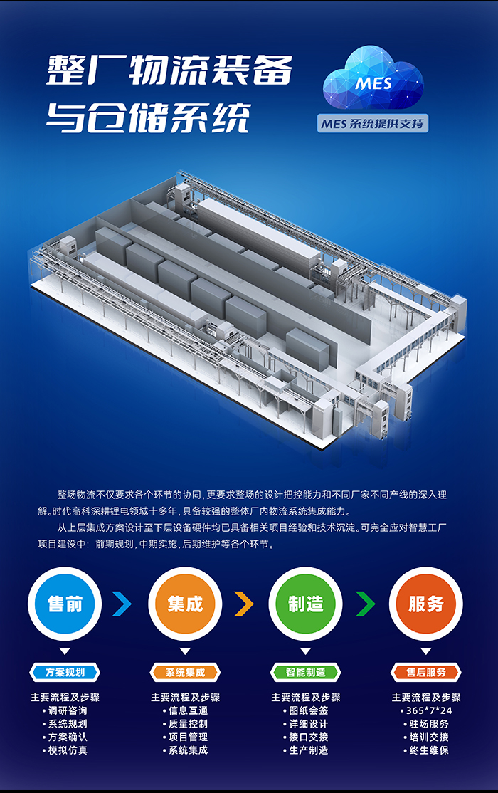 整厂物流装备与仓储系统将整个动力锂电池生产的各环节全部合理连接,通过存储设备、输送设备、装盘区设备、NG站等专机,并采用先进的机器人进行物料搬运,从电芯卷绕到最终成品,大大减少人工,甚至取代人工,实现了电池生产全工艺过程的自动化、智能化,达到生产企业预期的指标,帮助电池企业打造真正的智能车间。