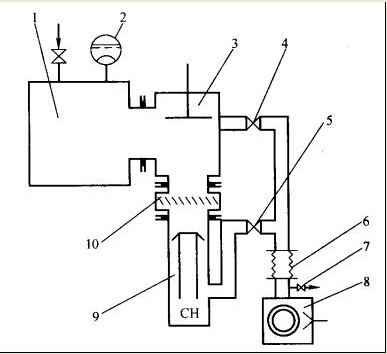 6-软连接管道;7-放气阀;8-前级泵; 9-主泵(油扩散泵);10-水冷障板