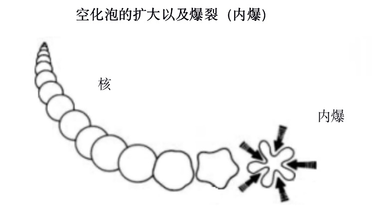 无论使用何种换能器,通常最基本的因素为其产生的空化效应的强度。超声波和其它声波一样,是一系列的压力点,即一种压缩和膨胀交替的波(如下图示)。如果声能足够强,液体在波的膨胀阶段被推开,由此产生气泡;而在波的压缩阶段,这些气泡就在液体中瞬间爆裂或内爆,产生一种非常有效的冲击力,特别适用于清洗。这个过程被称做空化作用。