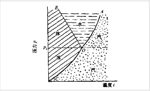 图中OA线为水气分界线,OB为冰一水两相分界线,即为冰的融化线。0℃线为冰气交界线,在此线上冰,气共存,即为冰真接由固相转为气相曲线。通常把这种由固相直接转变为气相的现象叫做升华。