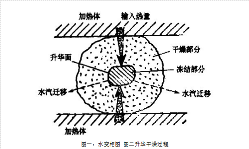 由上述可见,真空冷冻升华干燥过程首先是把食物中的水冻结成冰,然后供给升华热,使冰在三相点以下的温度下升华。升华速率的大小,显然与供给的热流量及冰升华潜热有关。