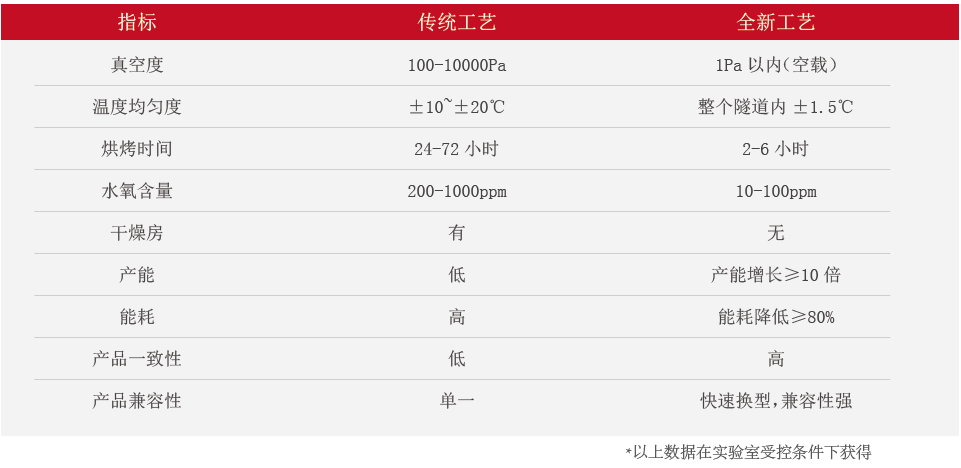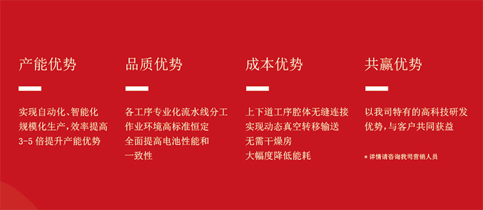 4、各工序专业完成单一功能,实现恒定的高真空度、低露点、高温度均匀度的干燥环境,极大地提高了产品的性能参数,同保障了单一批次和多批次的产品一致性